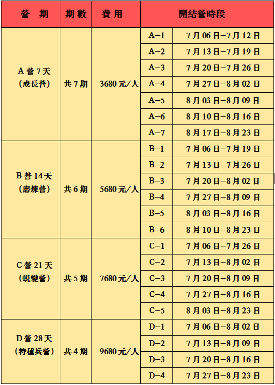 4、(28天特种兵营):28天的夏令营时间更长,训练内容更深入,收获也更丰富。 更深入的掌握特种兵军事技能,还会涉及更复杂的战术演练、野外生存技能等。强化的领导能力:更长时间的团队协作和任务分配,让孩子有机会担任领导角色,锻炼领导能力。 深度的自我管理能力,长时间的营地生活,让孩子在自我管理、时间管理等方面有更深入的锻炼。更全面的心理成长,更长时间的挑战和团队合作,让孩子在心理素质、抗压能力和解决问题的能力上有更大的提升,适合12-16周岁青少年。