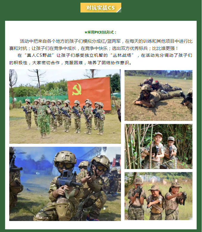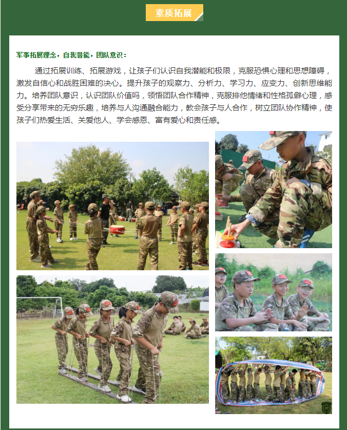 让孩子暂别父母无微不至的关爱,踏上一段独立的人生旅途,通过军事训练、活动竞技、团队协作、户外拓展、感恩教育、体验式培训等的方式,激发孩子们坚强、自信、感恩、自律、乐观、协作的优秀品质,全面提升孩子的自我管理和抗逆境能力,让孩子们度过一个更有意义的精彩假期。