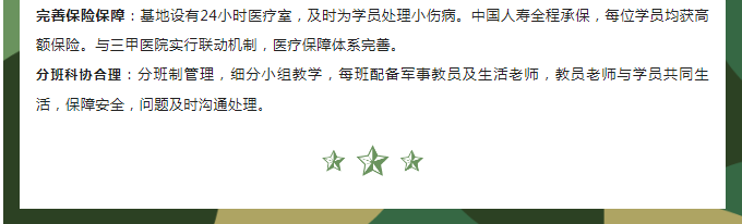 A:营地采取全封闭式管理,全天24小时军事教官、生活老师全程陪同。饮食、卫生管理均按部队标准执行。